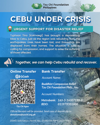Please send a copy of deposit slips or bank transaction confirmations via email at donations@tzuchi.org.ph or through Viber/Line/Wechat +639672110940