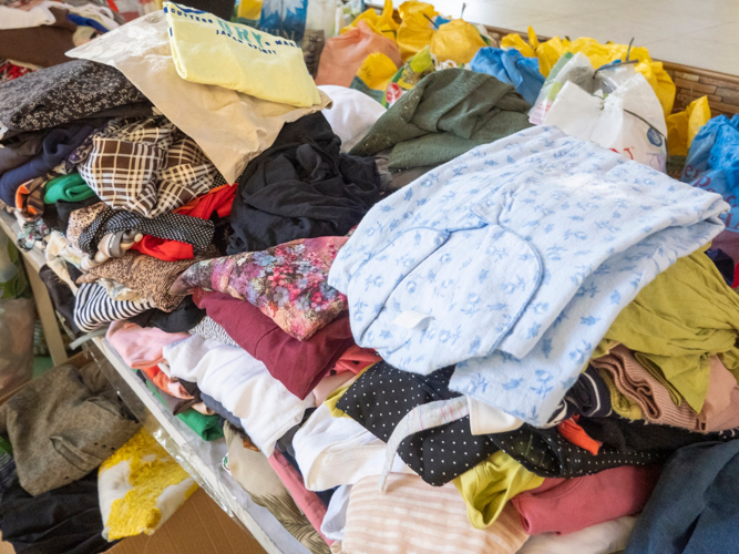 Pre-loved clothes are arranged before the start of the bazaar. 【Photo by Marella Saldonido】