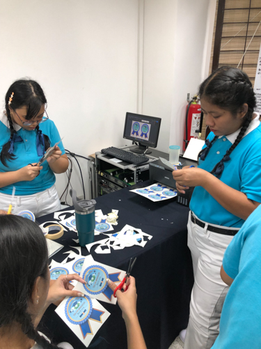 At the Harmony Hall, the camp’s working team print and cut medals for the graduating scholars.