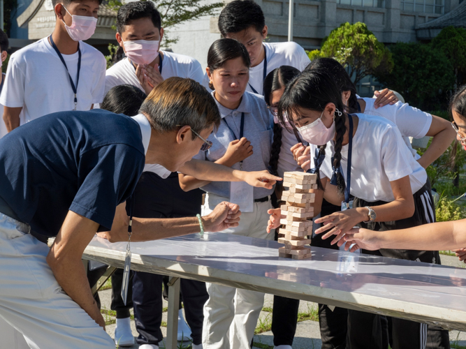 The traditional tour around BTCC became an “Amazing Race”-inspired event, with scholars working together to solve challenges like identifying the upcycled features in the Tzu Chi Café, building a Jing Si Abode using Jenga blocks, and using Charades to impart words like “porridge,” “baby shoes,” and “50 cents” in reference to Master Cheng Yen’s wooden cabin.