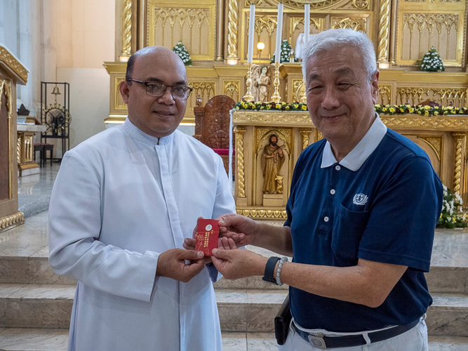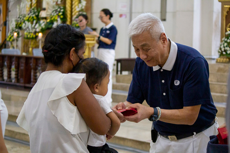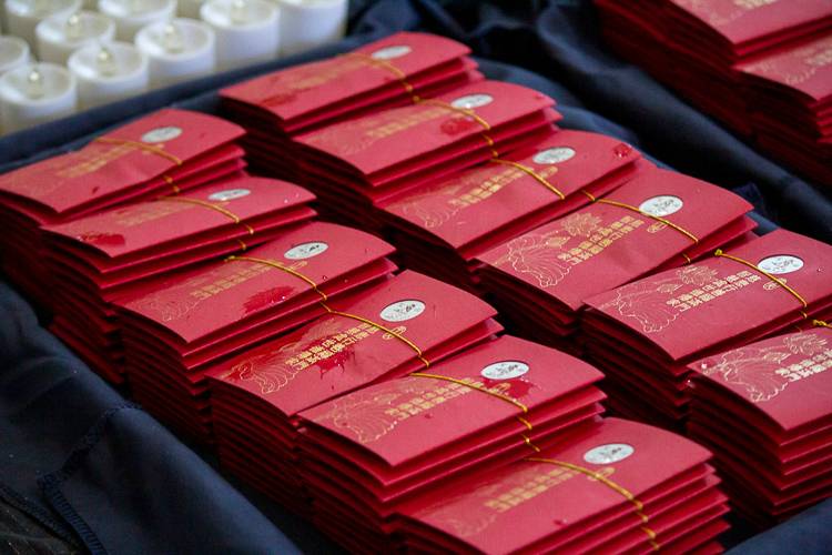 The parishioners receive a red envelope (angpao) blessed by Tzu Chi founder Dharma Master Cheng Yen. 【Photo by Matt Serrano】