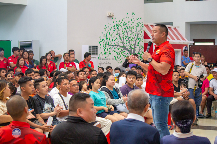 San Juan City Mayor Francis Zamora addresses his constituents during a distribution of relief for Barangay Batis fire victims on April 30 at San Juan City Hall. 【Photo by Marella Saldonido】