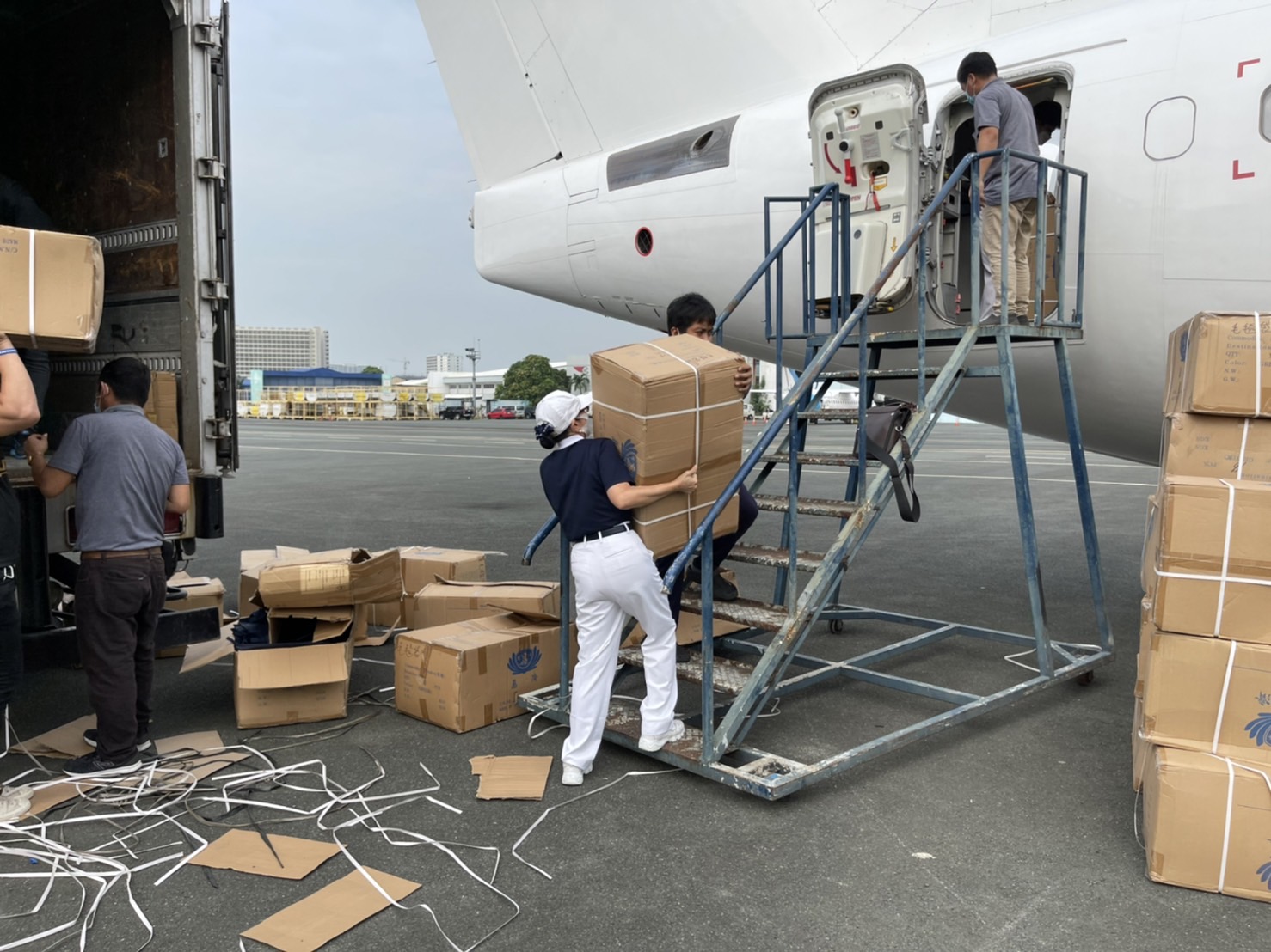 Tzu Chi volunteers load boxes of blankets into the private plane.