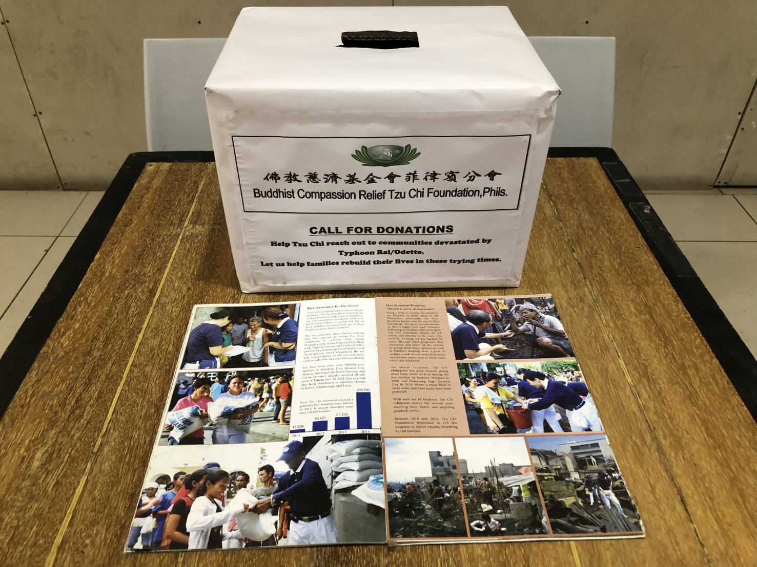 Pledges in any amount are placed inside donation boxes like this. A Tzu Chi pamphlet with pictures of various relief efforts undertaken through the years by the foundation shows donors exactly where their financial help goes.