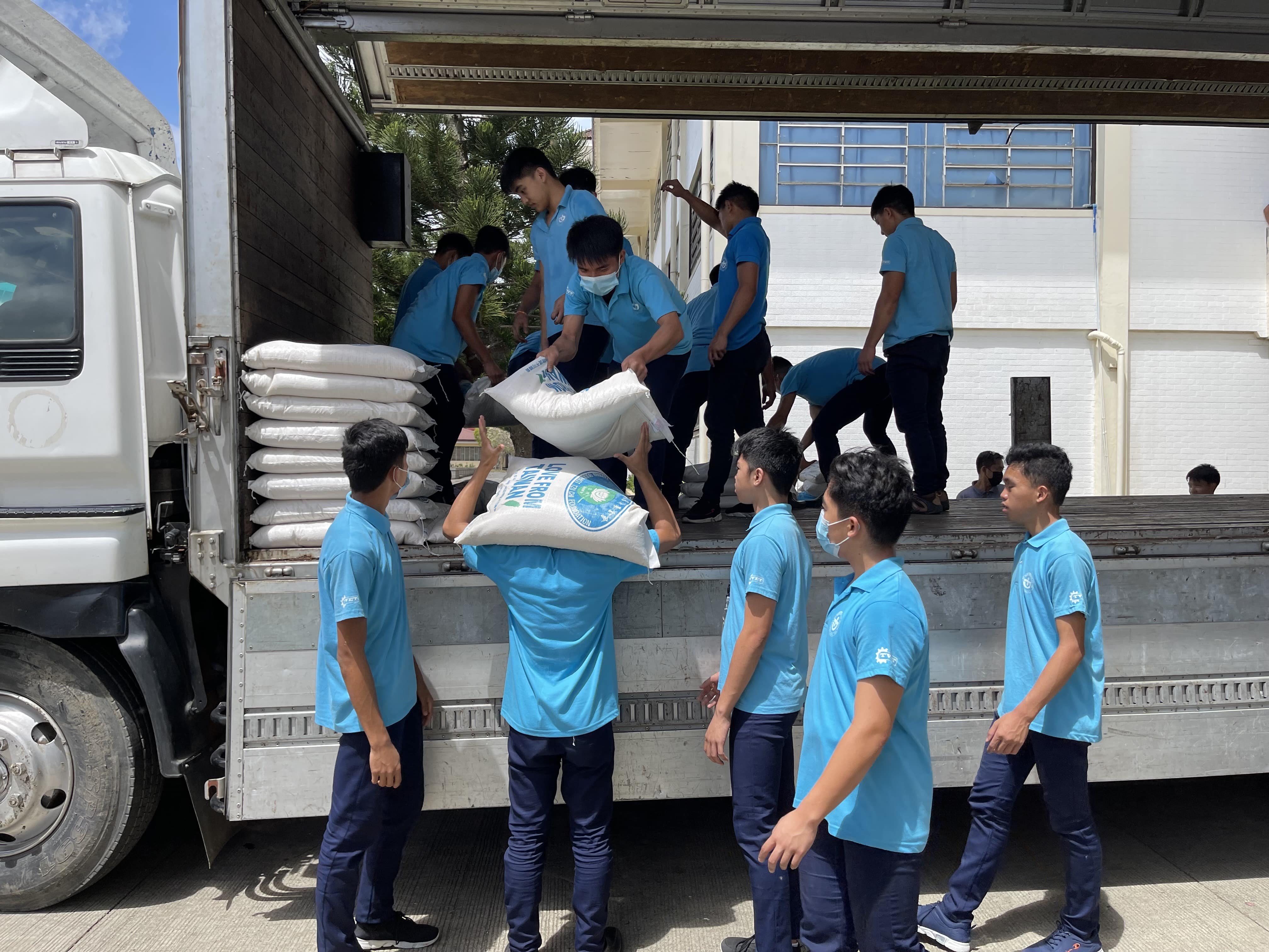 Boystown students help unload rice from the Tzu Chi Foundation truck.【Photo by Matt Serrano】