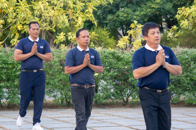 With palms together in prayer, Tzu Chi volunteers perform 3 steps and 1 bow from the garden path leading to the Jing Si Abode. 【Photo by Marella Saldonido】